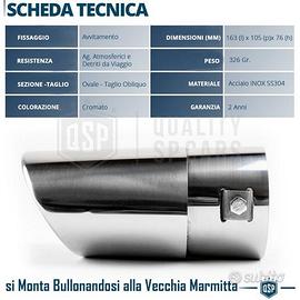 Terminale di Scarico OVALE per Vw GOLF VII, in ACCIAIO Cromato Inossidabile SS304 | Taglio a Fetta di Salame | Installazione Facile ad Incastro PLUG & PLAY - Look d' Impatto, Scarico Cromato - Installazione Facile ad Avvitamento - Alta Resistenza Alla Corrosione e Decoloramento - Eccellenza dei Materiali ""Dettagli/Tatto"" COMPATIBILITÀ: - Per Volkswagen GOLF 7 (2012-2017), con Singolo Scarico a Sinistra ACCIAIO INOX SS304: L' Acciaio Inox SS304 Rappresenta uno dei più Costosi Acciai in commercio, il Famoso ""18-10"" del Servizio di Posate o Pentole. E' un Acciaio Austenitico, poichè contiene un alto livello di Cromo, Esattamente il 18%, e l'8% di Nichel; le Propietà Fondamentali Sono: - Eccellente Nella Resistenza Alla Corrosione - Facilità di Ripulitura, Lucidatura ed Coefficente Igenico - Altissima Facilità di Lavorazione o Saldatura - Non è Particolarmente Magnetico TRASFORMAZIONE MARMITTA: Lo Scarico Cromato OVALE da All' Auto un Look Sportivo, Completamente Rinnovato MONTAGGIO: 1) Far Scorrere Il Nuovo Terminale sullo Scarico Esistente 2) Avvitare le Viti di Serraggio ogni 3 Settimane 3) In Alternativa Per Evitare il Costante Serraggio delle Viti, Consigliamo dei Punti di Saldatura di Sicurezza DETTAGLI TECNICI: - Materiale: Acciaio INOSSIDABILE - Sezione: Ovale - Taglio Obliquo: Si, a Fetta di Salame - Colore: Cromato - Finitura: Cromo - Peso: 0,326Kg - Dimensioni: LUN da 121>158 mm - LAR 102 mm - H 73 mm - Metallo Composto: 18% Cromo, 8% Nichel - Magnetismo: No - Basso - Confezionamento: Box Cartone Originale - Resistenza alle Intemperie: ELEVATA - Bloccaggio: a Bulloni - Lavorabilità: Eccellente (si Presta alla Saldatura) PER INFO CONTATTARE AL 3927091031 ANCHE LINEA WhatsApp OPPURE VIA E-MAIL: rtautoitalia2018@libero.it CONSEGNA: - Effettuiamo Spedizioni 24-48H in TUTTA ITALIA - Ritiro in Sede con Possibilità di Visionare il Prodotto - Vendiamo solo Articoli Nuovi PAGAMENTI: - PayPal - C