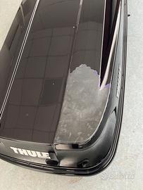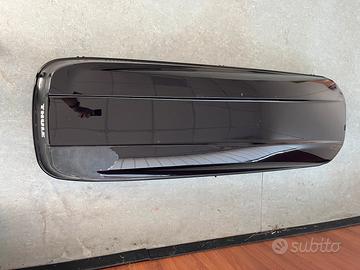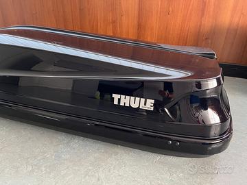 Vendo box Thule Touring Sport nero, completo di kit interno per fissaggio sci e luce, tutti accessori Thule. Ha un difetto nella vernice sulla parte alta posteriore.