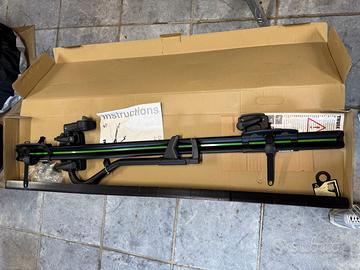 Thule coppia portabici da tetto in alluminio nero modello Cross con serratura antifurto usato una sola volta. Condizione perfetta. Aggancio universale su barre al tetto dell'auto.