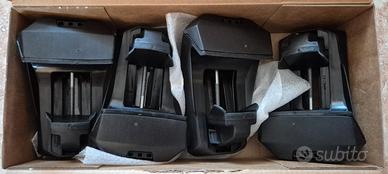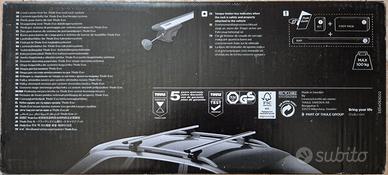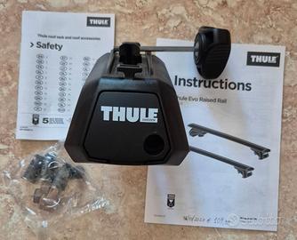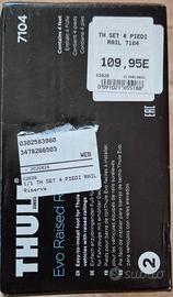 Thule kit 7104 evo raised rail nuovo, per fissaggio di barre trasversali da tetto a mancorrenti autoveicoli: adatto per barre Thule Wingbar, Wingbar evo, SlideBar, ProBar. Fornito in scatola originale, con 4 serrature (ancora da montare in sede), due chiavi di chiusura, utensile di serraggio, libretto d'istruzioni. Prezzo a nuovo nel 2020: 110 euro (attuale miglior prezzo 125 euro: Amazon).