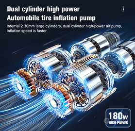 Pompa di gonfiaggio a doppio cilindro con azionamento diretto Con il motore ad azionamento diretto, i due cilindri comprimono l'aria allo stesso tempo, gonfiando in modo potente e veloce. Inoltre, il motore ad azionamento diretto riduce la velocità di rotazione, è più efficiente, compatto, silenzioso, stabile, facile da controllare.