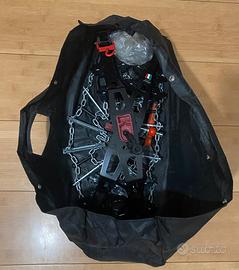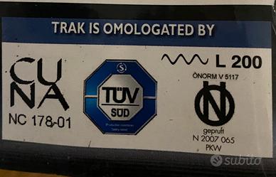CONFORMI ALLE NORMATIVE VIGENTI: le catene TRAK sono certificate TUV, CUNA NC 178-01, ON V 5117 e L 200. Adatte per le seguenti misure di pneumatico: 13" (195/70-13; 225/60-13), 14" (185/65-14; 205/60-14; 225/55-14), 15" (195/55-15; 215/50-15), 16" (175/55-16; 185/50-16; 195/50-16), 17" (205/40-17; 245/35-17). All'attuale catalogo TRAK con il codice 206 Catene da neve adatte a qualsiasi tipo di auto, comprese quelle che non accettano catene di tipo tradizionale a causa dello spazio ridotto tra pneumatici ed organi interni della ruota. UNIVERSALI: il montaggio avviene solo sulla parte esterna degli pneumatici senza interferire con gli organi meccanici interni della ruota; le catene Trak sono pertanto adatte anche per le vetture definite non catenabili dalle case automobilistiche. FACILI DA MONTARE: è sufficiente posizionare la catena su una parte del pneumatico; sfruttando l'avanzamento dell'automobile, Trak sale da sola sulla ruota senza essere toccata. Il fissaggio inoltre avviene solo sulla parte esterna delle ruote motrici per cui non sono necessarie difficoltose operazioni per allacciare la catena sulla parte interna della ruota. MASSIMA ADERENZA: Trak si autoregola; ciò consente una perfetta aderenza della catena al battistrada del pneumatico che si traduce in una guida sicura e silenziosa. ULTRA ROBUSTE: maglie in acciaio altolegato a sezione tonda di diametro 4 mm., cementate e zincate elettroliticamente; traversini in acciaio cementato e zincato; barre rinforzanti in acciaio al boro e tenditore autotensionante in mescola.