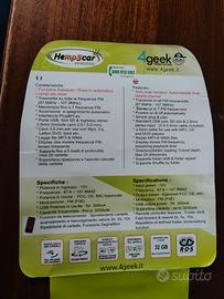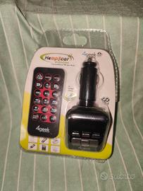Trasmettitore FM per auto 4geek NUOVO mai usato aperto solo per fare le foto del contenuto della confezione, ancora con la plastica sulla batteria del telecomando, con lettore di schede SD + Adattatore Doppia Presa Accendisigari SBS per ricarica di due apparati, anch' esso nuovo sigillato.
