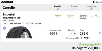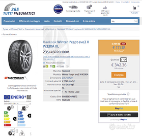 IL TRENO DI GOMME E' COSI' COMPOSTO: COPPIA DI GOMME INVERNALI APPENA ACQUISTATE MAI MONTATE ( vedi fattura) marca HANKOOK TOP DI GAMMA 235 45 R20 100V XL I-CEPT EVO3 ((Miglior prezzo in internet 342 €)) Ho cambiato auto a Novembre e le nuove ruote hanno misure che non coincidono. ----PIU'.....--- N° 2 GOMME INVERNALE IMPERIAL SNOW DRAGON UHP 235 45 R20 V100 XL SALVA CERCHIO . ----PIU'.....--- N°1 IDENTICA GOMMA INVERNALE IMPERIAL SNOW DRAGON UHP 235 45 R20 V100 XL SALVA CERCHIO --MA LEGGERMENTE ROVIVATA SUL BORDO DA USARE COME COPERTURA RUOTA DI SCORTA . IL PREZZO INCLUDE TUTTI E 4 I PNEUMATICI MENTRE IL QUINTO PNEUMATICO E' IN OMAGGIO Il prezzo in questo annuncio è valido SE RITIRATI DI PERSONA. Sono a disposizione per qualsiasi chiarimento. ATTENZIOME SE ACQUISTATE A DISTANZA, --IN FORMULA VISTO E PIACIUTO--PER IL VOLUME E PESO DEL COLLO, CALCOLERÒ IN AGGIUNTA I COSTI DEL PALLET+ IMBALLAGGIO +SPEDIZIONE CON CORRIERE PER CUI, INDICATIVAMENTE, SE in Italia BISOGNA AGGIUNGERE CIRCA 70 euro ).