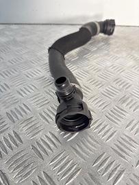 Tubo acqua radiatore BMW X5 X6 N57 Euro 6, manicotto circuito raffreddamento collegamento radiatore con raccordo rapido in plastica e molletta metallica di bloccaggio. Tubazione flessibile in gomma tecnica con protezione antisfregamento in calza nera e raccordo laterale per linea secondaria o sfiato. Componente destinato al collegamento tra motore e radiatore nel sistema di raffreddamento N57 Euro 6.