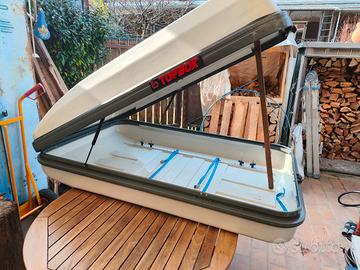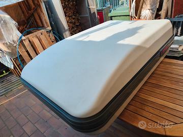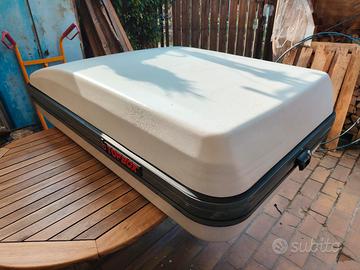 Vendo bagagliera per barre portatutto auto e ideale anche per camper, modello top box molto resistente. Misure lung.140cm. larg.90 cm h.37 cm. serratura senza chiavi. prezzo € 100 no spedizione