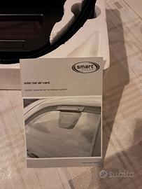 Apparecchio che si applica sulla parte superiore del vetro auto e con l'alimentazione a energia solare aiuta a ridurre la temperatura dell'abittacolo auto parcheggiata al sole.