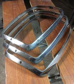 cedo in blocco due vetri faro mercedes, uno hella ed uno bosch, integri, e tre cornici stesso faro cromate, integre, cromature da rivedere, con zone ruvide.