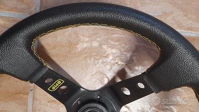 Volante a calice Omp per Lancia Delta Integrale. Profondità circa 9 cm. Corona rivestita in similpelle con cuciture gialle senza alcun segno di usura. Tappo clacson con stemma Lancia.