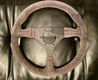 Volante da competizione rivestito in alcantara grigia con impunture gialle a richiamo del marchio inciso sulla razza centrale.