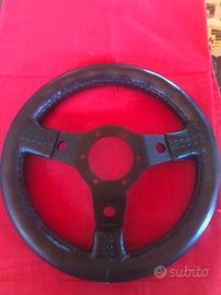 Volante nuovo in tannegum nera con razze nere. Diametro 32 centimetri. Completo di pulsante clacson a scelta. Disponibile anche mozzo per tutte le vetture anche con airbag.