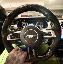 Volante per Ford Mustang compatibile con versioni 2.3/3.7/5.0 dal 2015 al 2024. Volante personalizzato con carbonio forgiato, pelle nera traforata e cuciture bianche.