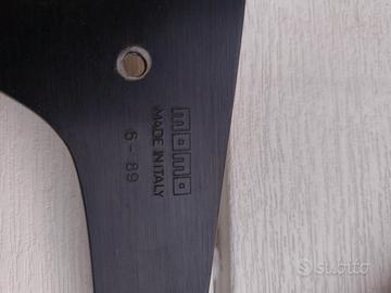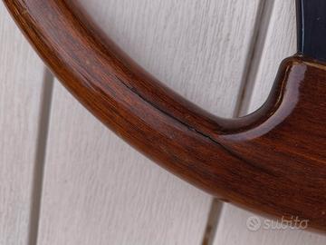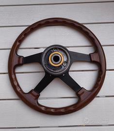 Volante Momo in legno 4 razze del 6/1989. Ottimo per auto d'epoca. Buone condizioni con segni d'usura come in foto facilmente riparabili con un veloce restauro. Presente anche un mozzo fiat con connettore clacson, non so esattamente di quale Fiat sia, ma è compatibile con qualsiasi auto a patto di avere il mozzo