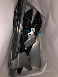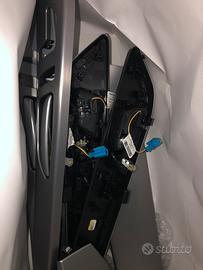 Set di panelli in alluminio per rivestimento cruscotto centrale x 4 porte. Sedili senza memoria e senza luce sotto (ambient light). Sono presenti imperfezioni, una scheggiatura sul pannello centrale e macchie sul lato conducente.
