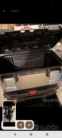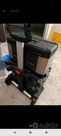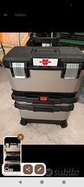 In materiale polipropilene e metallo Tutto facilmente accessibile Cassetta superiore con vaschetta estraibile, separabile con la semplice pressione di un bottone per permettere il trasporto del singolo elemento Guide cassetto con cuscinetti a sfera per scorrimento morbido e maggior capacità di carico Maniglia telescopica in alluminio per una presa più sicura Ruote grandi e gommate per una maggiore manovrabilità, confortevole, silenzioso e sicuro La base e il cassetto si aprono con più facilità formando una postazione di lavoro con tutti gli spazi accessibili Per la massima sicurezza sul posto di lavoro sono presenti delle asole per chiusura con lucchetto sulla cassetta superiore Scanalatura a V sul coperchio per permettere il taglio di materiali sul posto di lavoro contattemi per al tre info é foto