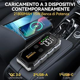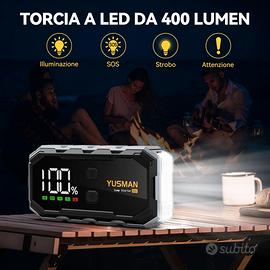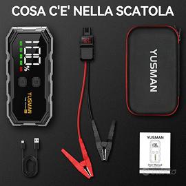Informazioni su questo articolo [Grande capacità Starter Batteria Auto] YUSMAN L'avviatore portatile per la batteria dotato di una corrente massima di 6000 A e una grande capacità di 21800 mAh, starter batteria auto Può essere avviato rapidamente veicoli a 12V (motore ALL gas o 10L diesel), avviatore batteria auto Adatto per auto, camion, motociclette, moto d'acqua, tosaerba, yacht, pick-up, motoslitte, ecc. avviatore auto Funziona in modo sicuro anche in ambienti estremi (-20℃~+60℃), quindi non dovrete più preoccuparvi di scaricare la batteria dell'auto nel freddo inverno o nel caldo estivo. [Banca di Energia Portatiled e Schermo a LCD] YUSMAN Non è solo un booster auto, ma anche una portatile Banca di potenza compatta di grande capacità, 21800mAh in grado di caricare facilmente telefoni, tablet o altri dispositivi,Dotato di una porta di uscita USB da 5 V/3A, QC3.0.starter batteria auto per schermo LCD mostra la potenza rimanente e lo stato operativo dell'avviatore di avviamento. [LED Illuminazione] YUSMAN Torcia a LED incorporata, con 4 modalità:Illuminazione/Attenzione/SOS/Strobe, molto adatta per campeggio, esterno, interno, emergenza, viaggi, ecc. booster avviamento auto lo strumento ideale per l'uso quotidiano, viaggi, gite all'aperto, situazioni di emergenza.Inoltre, starter auto portatile sue dimensioni sono molto ridotte, quindi è facile da trasportare o da mettere in valigia. [Morsetto di Sicurezza ] YUSMAN l'avviamento della batteria portatile ha 8 funzioni intelligenti di protezione dell'aggiornamento integrate (protezione da inversione di polarità, protezione da connessione inversa, protezione d