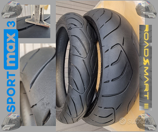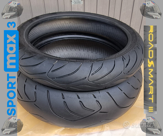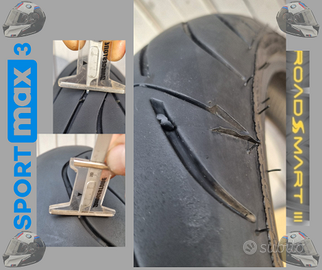 VENDO IN CONDIZIONI ECCELLENTI, coppia pneumatici DUNLOP SPORTMAX ROADSMART III 120 70 17 (58W) + POSTERIORE 190 55 17 (75W) mantenuti davvero davvero bene. Percorrenza massima 2200km condotti da pilota 59 anni sempre in moto da solo senza bagagli e passeggero, con andatura su percorsi misti sempre tranquilla rispettando codice stradale. Moto sempre su cavalletti anteriore e posteriore e sempre in garage in ambiente asciutto e areato (dimostrabile con foto) Nessuna riparazione e nessun taglio. Ha ancora alcuni baffetti di gomma su entrambi gli pneumatici sui bordi a testimonianza del poco sfruttamento sul manto stradale. Dot anteriore 9 2021 Dot posteriore 40 18. molte altre foto disponibili a richiesta. ATTENZIONE: VENDO SOLO A COPPIA e quindi non separatamente. grazie dell'attenzione