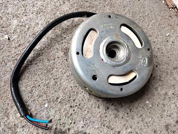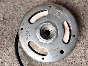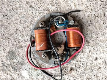 Vendo: 1 statore di accensione a puntine per ciclomotori d'epoca (anni '60, '70 e '80). È la parte fissa del generatore di corrente (volano magnetico) e serve a produrre l'elettricità necessaria per far scoccare la scintilla alla candela e per accendere le luci del motorino. Ecco i componenti principali che puoi vedere: Le Bobine (avvolgimenti in rame): Quelle due parti cilindriche ramate. Solitamente una serve per l'accensione del motore e l'altra per l'impianto luci. Le Puntine Platinate: Si trovano nella parte inferiore. Sono una sorta di interruttore meccanico che, aprendosi e chiudendosi, comanda il momento esatto della scintilla. Il Condensatore: Quel piccolo cilindro metallico in alto con i fili blu e neri. Serve a proteggere le puntine ed evitare che si brucino subito. Il Piatto Base: La struttura circolare in metallo (alluminio) su cui è montato tutto il resto. 2° Statore di accensione per ciclomotori d'epoca, prodotto dall'azienda italiana CEV (Costruzioni Elettromeccaniche Venegonesi). In base ai codici visibili sul pezzo (Dis. 15575), si tratta di un componente fondamentale del sistema elettrico di vecchi motorini degli anni '70 e '80. Caratteristiche del pezzo Produttore: CEV, marchio storico di Milano specializzato in componentistica elettrica per moto e ciclomotori. Componenti visibili: Sono presenti due bobine di rame (quegli avvolgimenti arancioni/ramati) che trasformano il movimento meccanico del rotore in energia elettrica. Compatibilità: Questo tipo di statore veniva montato su un'ampia gamma di mezzi d'epoca italiani, inclusi modelli di marchi come Aprilia, Garelli, Malaguti, Minarelli o Morini. Dato che i cavi in alto appaiono tagliati o scoperti, è probabile che lo statore debba essere ricablato o testato per verificare che le bobine non siano "bruciate" o interrotte