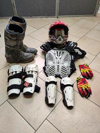 vendo abbigliamento completo per motocross stivali acerbis, casco con occhiali, pettorina più ginocchiere e gomitiere, 2 completi di pantaloni e maglietta della ufo più guanti, per info contattatemi. prezzo da concordare.