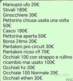 Vendo come da titolo attrezzature motocross..... Stivali-2 pettorine una chiusa e una aperta - ginocchiere - 4 paia di occhiali cn custodia 24mx-borsone 24mx-un casco seminuovo usato due volte pagato 700? nuovo.... Per qualsiasi cosa potete chiamarmi... Non spedisco ritiro a mano. Prezzo trattabile