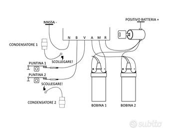 Collegamento senza modifiche all'impianto originale, scollegare solo i condensatori di serie. L’installazione è consigliata in zona adeguata e sicura (evitare fissaggi diretti sul motore, zona collettori scarico e vicino ad organi in movimento), tramite apposito foro di fissaggio. Collegare il cavo rosso al + (sotto chiave), il cavo nero al - (massa), il cavo blu alla puntina 1, il cavo arancione alla bobina 1, il cavo viola alla puntina 2 e il cavo marrone alla bobina 2. Istruzioni di montaggio presenti nella confezione.