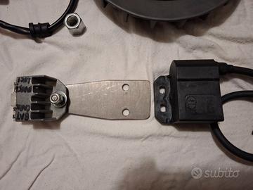 Vendo accensione parmakit fasatura ad anticipo variabile 1kg cono 20 mm volano lavorato dal pieno (e non borchiato) volendo ho anche il cono di riduzione crimaz da 19 mm per montare su alberi da 19mm, il piattello dello statore già lavorato per montare su qualsiasi tipo di carter (esempio quattrini)ecc ecc fornisco tutto completo in più volendo ho il devioluci nuovo già modificato per impianto elettrico vespa et3 special ecc. Fornisco anche staffa per regolatore e centralina per alloggiamento nel portaoggetti et3, anche il micro per pedale freno posteriore, è tutto praticamente nuovo e usata pochissimo. Euro 220 spedisco con pacco celere tracciabile o ritiro a mano a casa mia per piu info contattatemi al 3389324645 Nicola