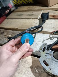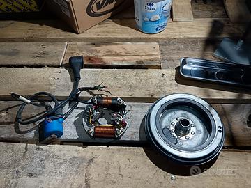 Ascensione a puntine smontata da una vespa special ( non sono un meccanico quindi non fatemi domande tecniche ) l'accensione è stata smontata funzionante per passaggio a sip e montaggio batteria per luci e contakm digitale.