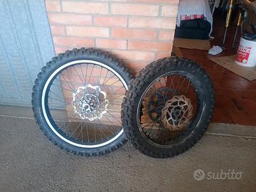 cerchi gommati enduro 21-18 praticamente nuovi con dischi freno e corona da 62 :gomma anteriore maxxis 90/90-21;gomma posteriore Pirelli 110/80-18 (250€)