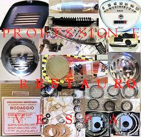 kit restauro pezzi di ricambio (FOTO 2) - VESPA125 NUOVA ( VMA1M VMA1T ) - 125PRIMAVERA ( VMA2M VMA2T ) - - 125ET3 ( VMB1T VMB1M ) Elenco parti 230 euro: Manopole Piaggio Leve freno/frizione + 2 VITI Faro anteriore Ghiera faro cromata Scritta anteriore Vespa Targhetta posteriore 125Primavera Cresta cromata per parafango Stemma Piaggio Anteriore SalvaBordo scudo originale Copri-oscillante anteriore Serie gommini per: leva miscela, passacavi,freno, 5 gommini funghetto + 2 boccole laterali per sportellino motore. Guarnizione claxon Scarpe cavalletto originali Soffietto del collettore carburatore Cuffia copri cilindro Vano portaoggetti Serie Strisce pedane battitacco complete Tappetino centrale + listelli Tappeto grande per le pedane 2 Tappi tamburo Fanale Stop post. completo Cornice targa cromata Il costo di questo Kit di Restauro è 230Euro A parte altri ricambi coi prezzi E=EURO Kit guaine + fili comandi nuovi E20 Etichetta post ET3 rossa E5 Adesivi laterali ET3 electronic E24 Sportello motore E20 Impianto elettrico per Primavera I°,II°; E32 per ET3 E45 Serratura bloccasterzo E 10; bauletto E14 Sella lunga primavera E79 - per ET3 E89 Parafango anteriore 28 Serbatoio E69 Bauletto portaoggetti retro scudo E89 Commutatore Devioluci originali E24 Quadro con chiave sul manubrio ET3 E16 Claxon E32 Specchio E18 Ammortizzatore anteriore E28; posteriore E35 Pedana in ferro E79 Scudo intero completo E155 Cavalletto E18 Pedivella messa moto E18 Marmitta a saponetta E38; siluro cromata E89; siluro nera E65 Ganasce anteriori E9; post.E10 Asta portaruota di scorta E22 Cerchio E16 3 copertoni 3.00-10 neri E58; fascia bianca E89 3 Camere E15 Contachilometri con cavo e rinvio Euro79 Cuscinetti sterzo E25 Guarnizioni motore E7; Paraoli 9 Cuscinetti albero mot Euro 25 Albero motore E85 Carburatore 19 E75 Filtro Polini E16 Gruppo Termico DR 130 - E139 CONTRASSEGN0