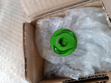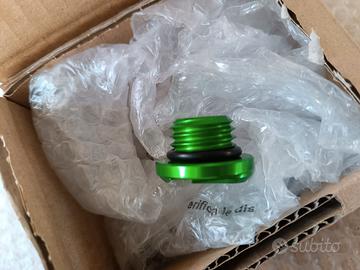 Accessori per moto Kawasaki quali tamponi per ZX-10R (50 €), tappo olio per Z900 Z800 Z650 Z1000 (15€), contrappesi (15€), nottolini M8 (12€) e altro. Disponibili in colore verde. 349 658 11 50