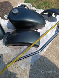 Come da titolo vendo serbatoio completo di tappo e rubinetto, parafanghi ant. E post.( Corto e lungo) Tutto Harley modificati per adattamento a dragstar, sellino artigianale completo con molle ricambio, prolunghe forcelle da 10 cm, contakilometri e contagiri con attacco al telaio, carter sotto sella e triangoli telaio , staffe avanzamento pedane, manunbrio da cm 85, regalo vernice per eventuali ritocchi e staffa targa laterale , Lievissimi segni di usura. Preferisco ritiro a mano, ma posso spedire a carico dell' acquirente. prezzo lievemente trattabile. Tel.3313681709 mimmo