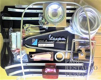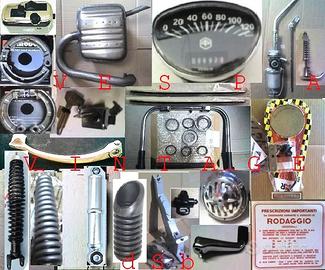 KIT Ricambi per Restauro VESPA125 VESPA150 SUPER dal 1965 TELAIO VNC1T VBC1T VNC1M VBC1M VBC VNC VESPASUPER Kit 235 euro ( FOTO 1 e 2 ) : Faro anteriore in vetro Ghiera faro Manopole Piaggio Leve freno/frizione + 2 viti Cresta parafango Scritta ant. VESPA + SUPER Scritta post. 125 oppure 150 SUPER Stemma Piaggio ant. Bordo scudo in alluminio originale Coprioscillante ruota ant. Gommini per: freno , pedivella avviamento, leva mix, gommino passa tubo benzina e passacavi. Guarniz. claxon Guarnizione serbatoio Guarnizioni cofani Scarpette cavalletto Strisce pedane complete di gomma nera,puntali e viti di montaggio Tappetino centrale + coppia listelli Tappeto grande Vetrino Stop Cornice targa cromata IL COSTO DI QUESTO KIT è 235 EURO A PARTE ALTRE PARTI E PEZZI DI RICAMBIO COI PREZZI DI FIANCO: E = EURO Serie guaine + fili nuovi E20 Pomello aria + filo E7 Contachilometri originale E112, riprodotto E65 Filo conta/km + ingranaggio E10 Sella lunga Aquila o Piaggio E109; riprodotta E89 Kit selle anteriore e post. E125 Piastra portapacchi E34 Copriruota scorta E32 Fanale Stop originale E95; riprodotto. E39 Cavalletto E18 Impianto elettrico originali E32 Pulsante stop E6 Pulsanti luci E24 Morsettiera mot. E9 Serratura del Bloccasterzo E10; del portaoggetti E14 Cerchio ruota E33 Modanature fregi cofano e paraf. (2pz) E20 Parafango E46 Etichette rodaggio + usare mix 2% E10 Specchietto SX E18 3 Gomme 3.50-8 fascia bianca E90; neri E58 3 camere E15 Ammortizzatore ant. E28; post. completo E35 Pedana E89 Scudo intero E179 Cofani Laterali E209 Ganasce Ant. E10; Post. E18 Marmitta E58 Claxon E32 Asta ruota scorta E24 Kit Revisione Motore (FOTO 23 ) E296 Gruppo termico E145 Guarniz. motore E7 Ralle sterzo sup./ inf. E25 Soffietto aspirazione E7 Cuscinetti albero motore + paraoli E32 Kit cuscinetti motore E65 Rubinetto benzina + asta E18 Pedale freno E15 Paraspruzzi originali post. E10 Gancio cofano E9 CONTRASSEGNO