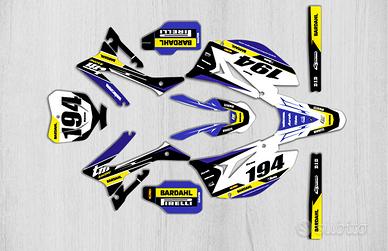 Gli adesivi sono realizzati con materiali crystal di prima qualità che permettono di adattarsi facilmente e perfettamente alle plastiche della moto del cliente. La resistenza del materiale permette alle nostre grafiche di rimanere correttamente incollate anche durante le più difficili condizioni di uso della moto. Il montaggio, grazie ai canali per lo scarico dell'aria, consente di installare agevolmente il prodotto e senza bolle. Utilizziamo macchinari di ultima generazione per la stampa, permettendo di stampare colori brillanti e sfumature in alta definizione. Sugli adesivi includiamo uno strato protettivo che riesce a mantenerli sempre lucenti nel corso degli anni, preservandoli anche da acqua e sporco. È possibile personalizzare il kit adesivi a proprio piacimento. Si possono aggiungere, togliere o sostituire sponsor tecnici, inserire un numero da gara personalizzato o il proprio nome. Si possono indicare tutte le modifiche nell'apposito spazio "Personalizzazione del prodotto" al momento dell'acquisto. Non ci limitiamo solo alle grafiche presenti sul nostro sito, inviandoci tramite mail o WhatsApp la foto di una grafica che non abbiamo, potremo farvi un preventivo e successivamente realizzarla.