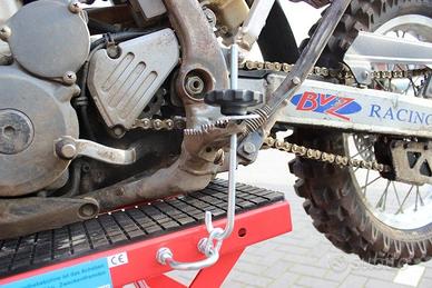 La pedana è dotata di due ganci laterali pensati per fissare ulteriormente il motociclo, migliorando la stabilità soprattutto quando si procede allo smontaggio di ruote, freni o sospensioni. La struttura compatta e solida rende questo sollevatore una soluzione ideale per officine specializzate, appassionati di meccanica, piccoli centri assistenza, box da gara e garage domestici.