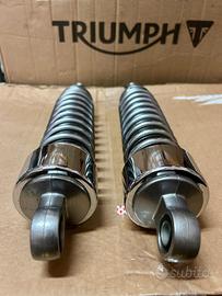 Coppia ammortizzatori originali triumph bonneville t100. Montano sui seguenti modelli: Bonneville 790 (2001-2007) Thruxton 900 (2004-2015), Bonneville 865/T100 (2005-2015), Bonneville SE (2009-2015). honda shadow 750, moto custom in generale, ottimi anche per moto anni 70 cafe racer e trasformazioni / restauro moto giapponesi kawasaki, suzuki, yamaha, honda Come nuovi, smontati da moto con 6500 km per cambio con showa. Acciaio Cromato interassi 34cm diametro foro fissaggio 1cm Spedizione accurata con imballagio adeguato.