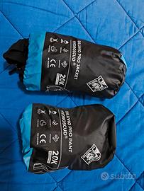 Vendo per doppio regalo identico - NUOVO nella confezione originale e con scontrino di acquisto (in GARANZIA) - Qualità TOP Il set (veste comodo) è : 1. Tucano GIACCA DILUVIO PRO Hydroscud Windscud - tg. M Tre strati con trattamento Water Resistant: membrana antivento, impermeabile e traspirante a elevata colonna d'acqua - Ergonomica ed elasticizzata per una vestibilità confortevole e antisventolio - 1 tasca interna - stampe rifrangenti 2. Tucano PANTALONE DILUVIO PRO Hydorscud Windscud - tg. S stesse caratteristiche della giacca - Gamba preformata per facilitare posizione di guida e vestizione - Senza cuciture davanti/retro per preservare la tenuta delle nastrature - Regolazioni in velcro Ripiegabili in bustina originale - Impermeabilità: 20.000 mm - Traspirabilità: 5.000 g/mq/24h