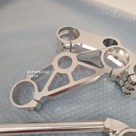 il kit piastre di sterzo ha la piastra inferiore maggiorata e sono complete di asse canotto e piastra superiore. Su richiesta semimanubri racing oppure riser per aprilia tuono.