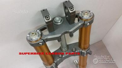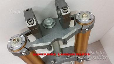 APRILIA TUONO: AVANTRENO SPECIALE CON FORCELLE OHLINS NIX 30 ULTIMO MODELLO. Kit costituito da: Forcelle ohlins nix 30 con il nuovo sistema di regolazione, piedini radiali speciali ricavati dal pieno con supporto abs se necessario, piastre di sterzo speciali ricavate dal pieno sovradimensionate con piastra inferiore da 60 mm a 3 punti di chiusura e superiore con riser e supporto blocchetto accensione . Tutto il kit è assolutamente plug & play ovvero si monta senza modifiche ed è progettato specificatamente per tutte le Aprilia Tuono anche V4. Per il montaggio si utilizzano boccole e cuscinetti originali. Tutte le parti ricavate dal pieno possono essere anodizzate di qualsiasi colore. Tutti gli accessori sopra menzionati sono nuovi. Possiamo progettare e realizzare qualsiasi specifica atta a rendere unica tale tipologia di prodotto. Tutte le parti ricavate dal pieno possono essere progettate e realizzate direttamente su specifiche tecniche ed estetiche del cliente. Con i nostri kit potete modificare e/o sostituire l'avantreno di qualsiasi moto e renderla unica. Progettiamo e realiziamo un avantreno completo di tutte le parti. Le forcelle sono appositamente modificate per essere perfettamente compatibili con il tipo di moto. Potete utilizzare qualsiasi cerchio e dischi freno. Il kit può essere realizzato sia per pinze radiali sia per pinze ad attacco assiale (di cui sono dotate le moto più vecchiotte) o perimetrale (vedi Buell o alcune Harley Davidson). I nostri kit avantreni speciali si montano senza dover effettuare alcun adattamento. Possiamo fornire come optional: cerchi Oz, Dymag, Pvm, dischi e pinze freno brembo, parafango carbonio, off set regolabile delle piastre. Progettiamo e Realizziamo avantreni speciali per cafe racer, scrambler, streetfighter, superbike, prototipi. Possiamo realizzare per qualsiasi moto il kit piastre speciali e il kit di montaggio (perno ruota , boccole etc) anche per forcelle e cerchi di qualsiasi tipologia, forniti dai clienti.