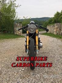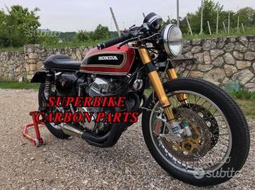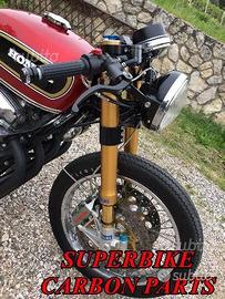 PER QUALSIASI MOTO PROGETTIAMO E REALIZZIAMO AVANTRENI SPECIALI COMPLETI . PRESENTIAMO KIT AVANTRENO HONDA CB 650 CAFE RACER Possiamo realizzare per qualsiasi moto kit piastre speciali e kit di montaggio (perno ruota , boccole etc) anche per forcelle e cerchi di qualsiasi tipologia, forniti dal cliente. Kit costituito da: piastre di sterzo speciali ricavate dal pieno e sovradimensionate con piastra inferiore da 60 mm a 3 punti di chiusura oppure 80 mm a 4 punti di chiusura con cave di alleggerimento passanti. Riser o semimanubri a richiesta. Possiamo realizzare attacchi o supporti per blocco accensione, amm. di sterzo, blocca sterzo, strumentazioni etc...Tutto il kit è assolutamente plug & play ovvero si monta senza modifiche ed è progettato specificatamente su richiesta PER QUALSIASI MOTO. Per il montaggio si utilizzano boccole e cuscinetti originali. Tutte le parti ricavate dal pieno possono essere anodizzate di qualsiasi colore. Possiamo progettare e realizzare qualsiasi specifica atta a rendere unica tale tipologia di prodotto. Tutte le parti ricavate dal pieno possono essere progettate e realizzate direttamente su specifiche tecniche ed estetiche del cliente. Con i nostri kit potete modificare e/o sostituire l'avantreno di qualsiasi moto e renderla unica UTILIZZANDO QUALSIASI FORCELLA E CERCHIO ANTERIORE DI VOSTRO GRADIMENTO E IN VOSTRO POSSESSO. Il kit può essere realizzato sia per pinze radiali sia per pinze ad attacco assiale o perimetrale (vedi Buell o alcune Harley Davidson). Possiamo fornire come optional: FORCELLE OHLINS, cerchi Oz, Dymag, Pvm, dischi e pinze freno brembo, parafango carbonio, off set regolabile delle piastre. Progettiamo e Realizziamo ANCHE avantreni speciali COMPLETI DI FORCELLE OHLINS per cafe racer, scrambler, streetfighter, superbike, prototipi.