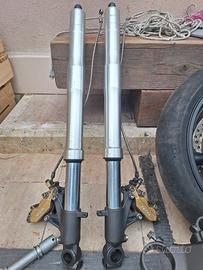 per cbr 954 929 avantreno composto da: steli forcella pinze perno tubi in treccia cerchio dischi piastre semimanubri tutto in ottimo stato (qualche segno d'usura sugli steli, dovuto allo smontaggio ed allo stoccaggio) nessuna rottura nessuna perdita e tutto in ottimo stato estetico e funzionale. perfetto per trasformazione caferacer o per upgrade su hornet vtr firestorm o cbr 600. prezzo fisso spedisco ma non in contrassegno - gradito il ritiro di persona