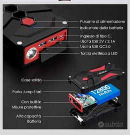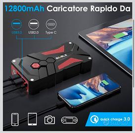 Avviatore portatile compatto e potente, ideale per affrontare batterie scariche in autonomia. Perfetto per auto, moto, SUV, furgoni e piccoli motori. Caratteristiche principali: •🔋 Capacità 12800mAh – più avviamenti con una sola carica •🚗 Compatibile 12V – fino a 7.0L benzina / 5.5L diesel •⚡ Avviamento rapido con pinze intelligenti (protezione anti corto, inversione polarità, sovraccarico) •🔌 Power bank integrato – USB 3.0 + USB 2.0 + Type-C •💡 Torcia LED multifunzione – luce normale, strobo, SOS, emergenza •📊 Indicatori LED per livello batteria •🧱 Scocca robusta e antiurto Ideale per: •Emergenze su strada •Uso quotidiano (tenere in auto sempre pronto) •Viaggi lunghi o moto Condizioni: Nuovo Contenuto: •Avviatore •Pinze smart •Cavo ricarica