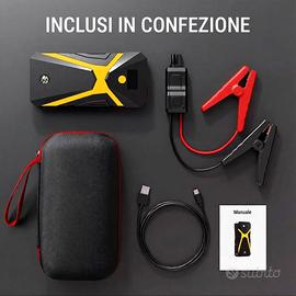 * **Contenuto:** Booster, caricabatterie (rete/auto), morsetti a coccodrillo, cavi, manuale, valigetta.
