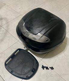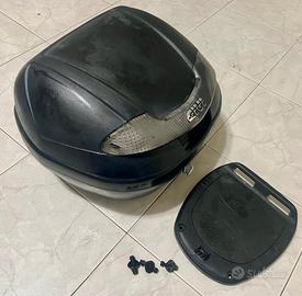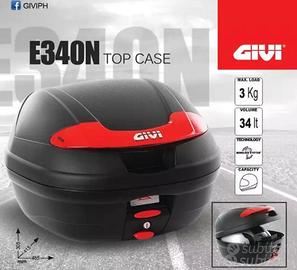 - Il bauletto è un GIVI E340N Tech , ha una capienza di 35lt (cioè 2 caschi Momo, o 1 integrale), è completo di base di fissaggio, perni, dadi, e 1 chiave, esternamente a causa delle intemperie a cui è stato sempre esposto si presenta abbastanza vissuto, ma internamente è praticamente nuovo, quindi se non avete molte pretese è il bauletto ideale per voi.