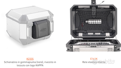 Vendo Bauletto K'Mission Monokey Alluminio Kappa KMS44A da 44 Litri, con Schienalino Kappa K233S e Rete Elastica Interna Kappa E161K. Ottime condizioni usato 5 volte, doppie chiavi. Spedisco o ritiro a mano zona Roma sud