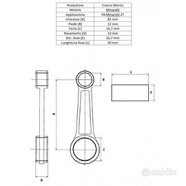 (R.16362) Vendo biella completa nuova con bronzina per Franco Morini e FB Minarelli 48 cc 2 tempi a due e tre velocità , marchiata Franco Morini con interasse fori di 85 mm diametro asse 16,7 mm e lunghezza asse di 30 mm , per misure vedere foto