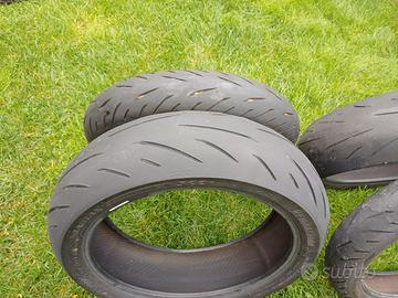 gomme moto brigestone battlax hypersport S 22 R in buono stato generale, nessun foro, nessuna riparazione, misure posteriore 180/55/17, anteriore 120/70/17. prezzo coppia super affare 60 euro. possibilita di spedizione. contatti. 3248731072