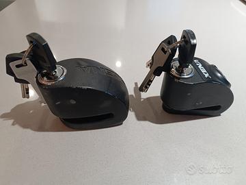 Vendo bloccadischi per moto e scooter,entrambi con perno da 6 mm completi di 3 chiavi ciascuno,utilizzano sensori per rilevare tentativi di furto o spostamenti indesiderati con avviso acustico sonoro potenza 120dB.Vendo anche separatamente.