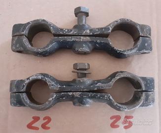 Vendo 2 coppie di blocchetti aperti fissaggio manubrio alla forcella per moto anni '30 Benelli Frera Sertum Guzzi ed altre, una coppia ha misure occhielli 22+22 mm, l'altra 22+25 mm, entrambe hanno interasse dei morsetti di 72 mm, in buone condizioni, filetti ok, vendo solo la coppia 35 € l'una, 60 € se acquistate entrambe le coppie.