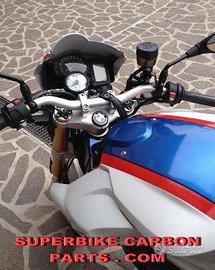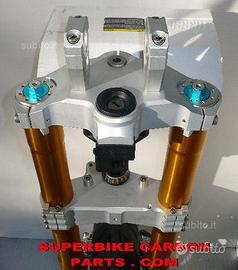 Per BMW F 800 R e F 800 S progettiamo e realizziamo avantreno speciale completo con forcelle ohlins R&T 43, kit costituito da: forcelle ohlins R&T 43 specifiche per questa tipologia di Bmw / kit piastre di sterzo speciali ricavate dal pieno (piastra inferiore, piastra superiore, raiser, alloggio blocchetto accensione, fermi battute di sterzo e supporti maschera faro) /piedini forcella radiali speciali ricavati da pieno (in alternativa forniamo gli originali du fusione ohlins come quelli in foto) pinze brembo radiali/lavorazione per supporto e riposizionamento sensore ABS /staffe parafango/perno ruota e boccole / parafango carbonio. tutto il kit è assolutamente plug & play ovvero si monta senza modifiche. Tutte le parti ricavate dal pieno (piastre di sterzo, piedini radiali, boccole,perno ruota, distanziali, raiser etc..) possono essere anodizzate di qualsiasi colore. Le forcelle ohlins sono disponibili con il fodero nero oppure con il fodero color oro, in entrambi i casi gli steli sono color oro. tutti gli accessori sopra menzionati sono nuovi e tutte le parti ricavate dal pieno possono essere realizzate direttamente su specifiche tecniche ed estetiche del cliente. ESSENDO I PRODUTTORI DI QUESTI ACCESSORI SPECIALI, POSSIAMO PROGETTARE E REALIZZARE QUALSIASI SPECIFICA ATTA A RENDERE UNICA TALE TIPOLOGIA DI PRODOTTO. POSSIAMO QUINDI REALIZZARE FORME DIFFERENTI, IN BASE AL GUSTO ESTETICO DEL CLIENTE, PER TUTTE LE PARTI RICAVATE DAL PIENO. Il kit piastre è costituito da piastra di sterzo inferiore, piastra di sterzo superiore, raiser, supporti battute sterzo, supporti maschera faro. Per il montaggio si utilizzano boccole e cuscinetti originali. Possiamo realizzare cave di alleggerimento passanti sia sulla piastra di sterzo superiore che inferiore (ad esempio con asole passanti sul lato della piastre inferiore in modo tale da vedere sotto il fodero della forcella). Possiamo progettare kit di questo tipo per qualsiasi tipologia di forcelle. Cottataci per info e costi.