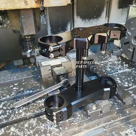 Le piastre di sterzo ricavate dal pieno sono maggiorate con piastra inferiore da 60mm a 3 punti di chiusura e piastra superiore a 2 punti di chiusura. Sono dotate di tutti gli attacchi presenti anche sulle originali a partire dal supporto alloggio blocchetto accensione e supporti riser.